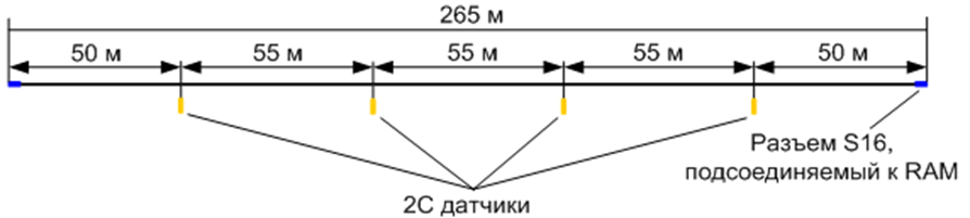 Схема секции сейсмокосы ARAM с четырьмя двухкомпонентными датчиками представлена на Рис. 2.11. Расстояние от крайнего канала до RAM 50 метров. Может использоваться при глубинах не более 43,3 метров без смещения крайнего канала при подключении RAM. При использовании на глубинах более 43,3 метров возможно смещение крайнего канала при подключении к RAM. Данные секции косы использовались при работах на Северо-Гуляевской площади.